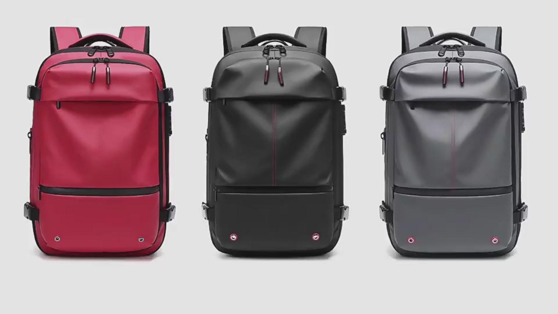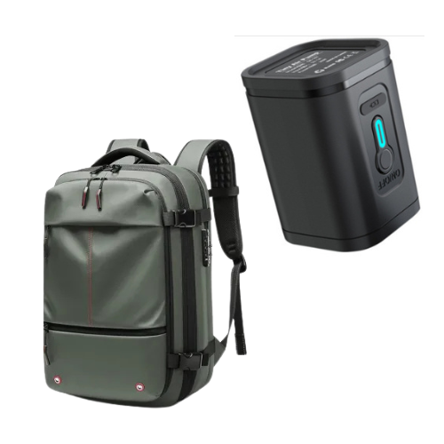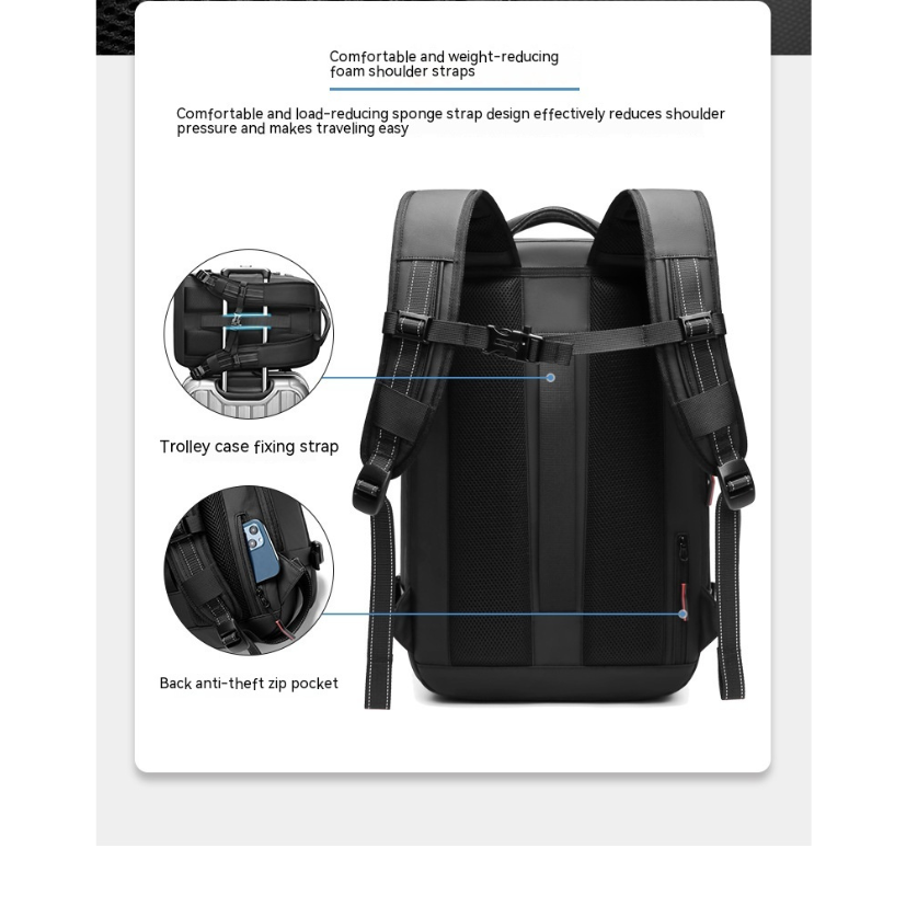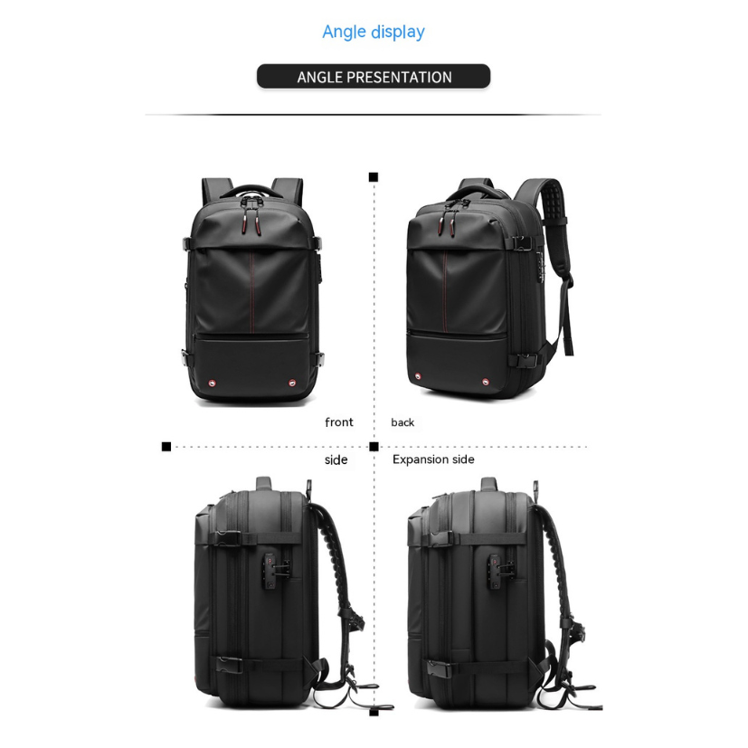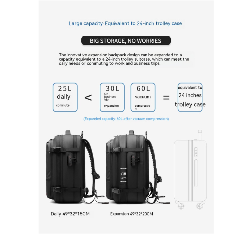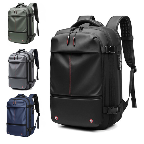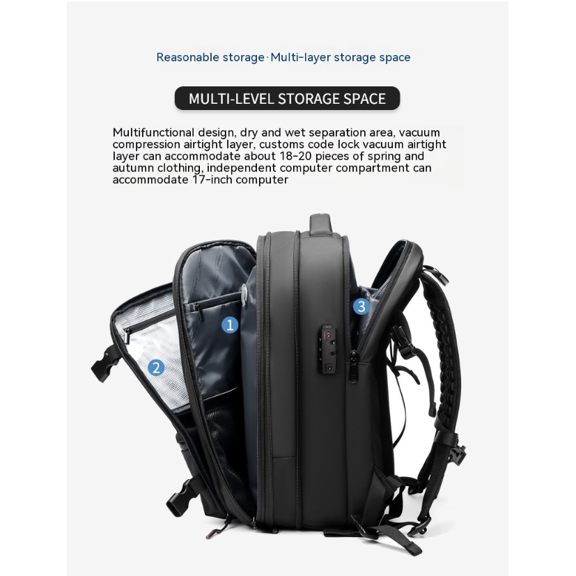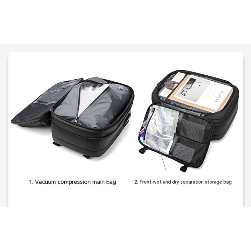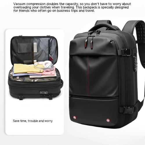 A vacuum-compression backpack that expands to 75L with multiple compartments for business travelers.